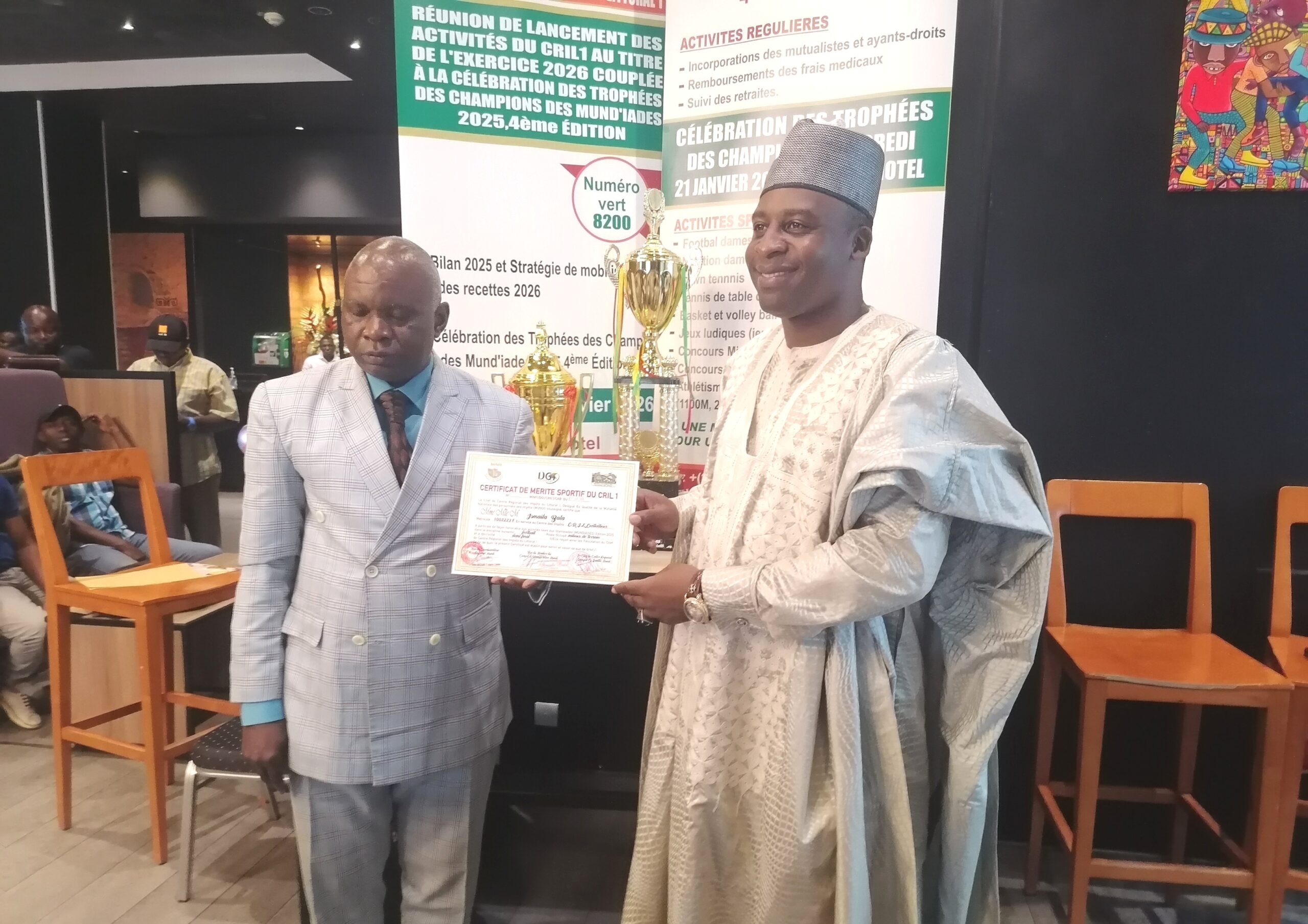 Les Jeux Olympiques de la Mutuelle Nationale des Personnels des Impôts (Olympiades Mundi), organisé par la Direction Générale des Impôts à Yaoundé comprennent 10 activités sportives et culturelles : le Football dames et messieurs, la Natation dames et messieurs, le Lawn tennis, le Tennis de table dames et messieurs, le Basket, le Boley Ball, les Jeux ludiques, le Concours Miss et Mister, le concours du meilleurs poème, l’Athlétisme dames et messieurs (1100m, 200m, 400m et 1500m). Le Centre régional du Littoral 1, a raflé tous les prix. Le sacre comprenant des médailles et des trophées a été célébré avec l’ensemble du personnel local de la fiscalité, au cour de cette cérémonie annexe.